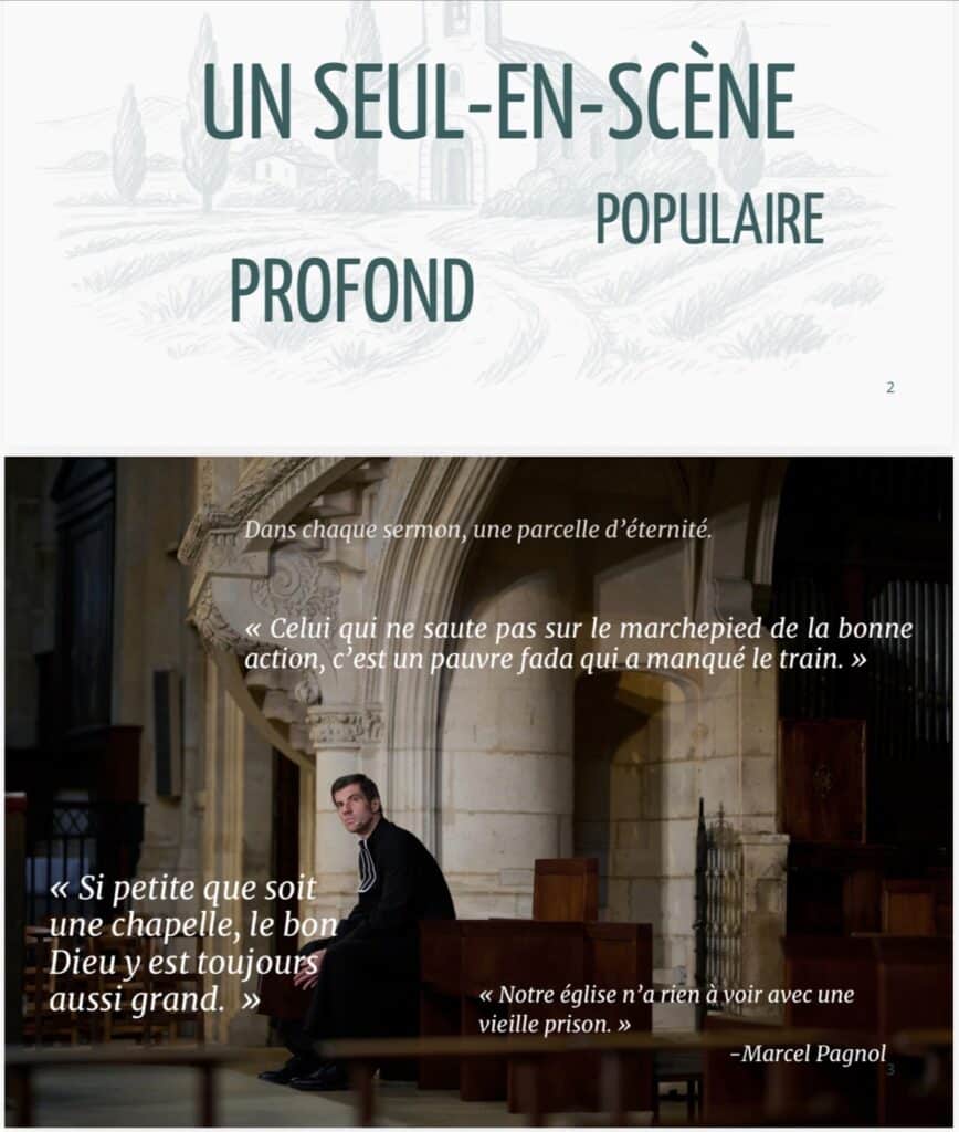 Venez écouter, rire, vibrer et vous émouvoir de chaque sermon. Et entendre, dans l’écho des murs, la voix de Pagnol résonner dans nos coeurs.