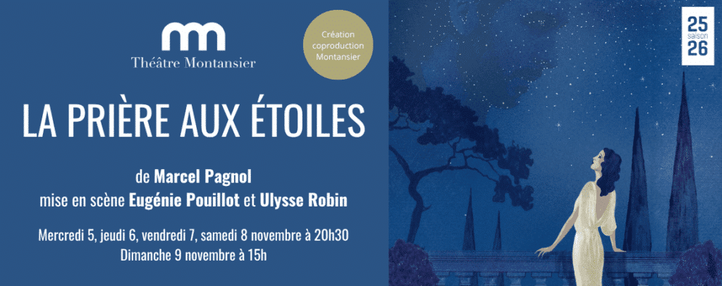 La Prière aux Étoiles est l’un des rares textes de Marcel Pagnol qui n’a encore jamais été joué. Au cinéma, seulement une partie du film a été retrouvée et il n’en existe à ce jour aucune adaptation théâtrale ou scénique. Monter au théâtre La Prière aux Étoiles, c’est donc d’abord présenter au public un texte inédit. Un scénario oublié qui prend vie pour la première fois. C’est donner à entendre la langue de Pagnol, appréciée par tant de monde, avec une histoire nouvelle et, à ce jour, méconnue.